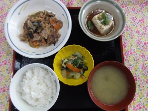*豚肉スタミナ炒め *煮奴 *三色お浸し *漬物 *汁物